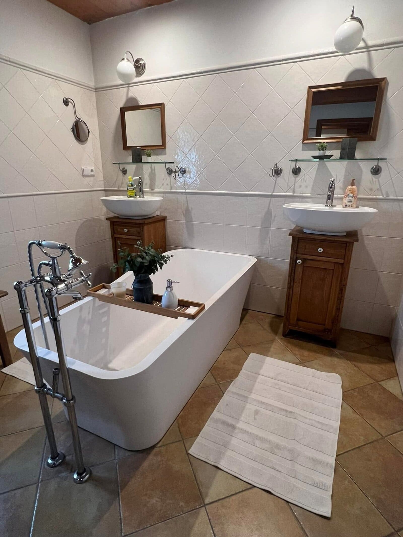 2 koupelny s volně stojící vanou a sprchou.